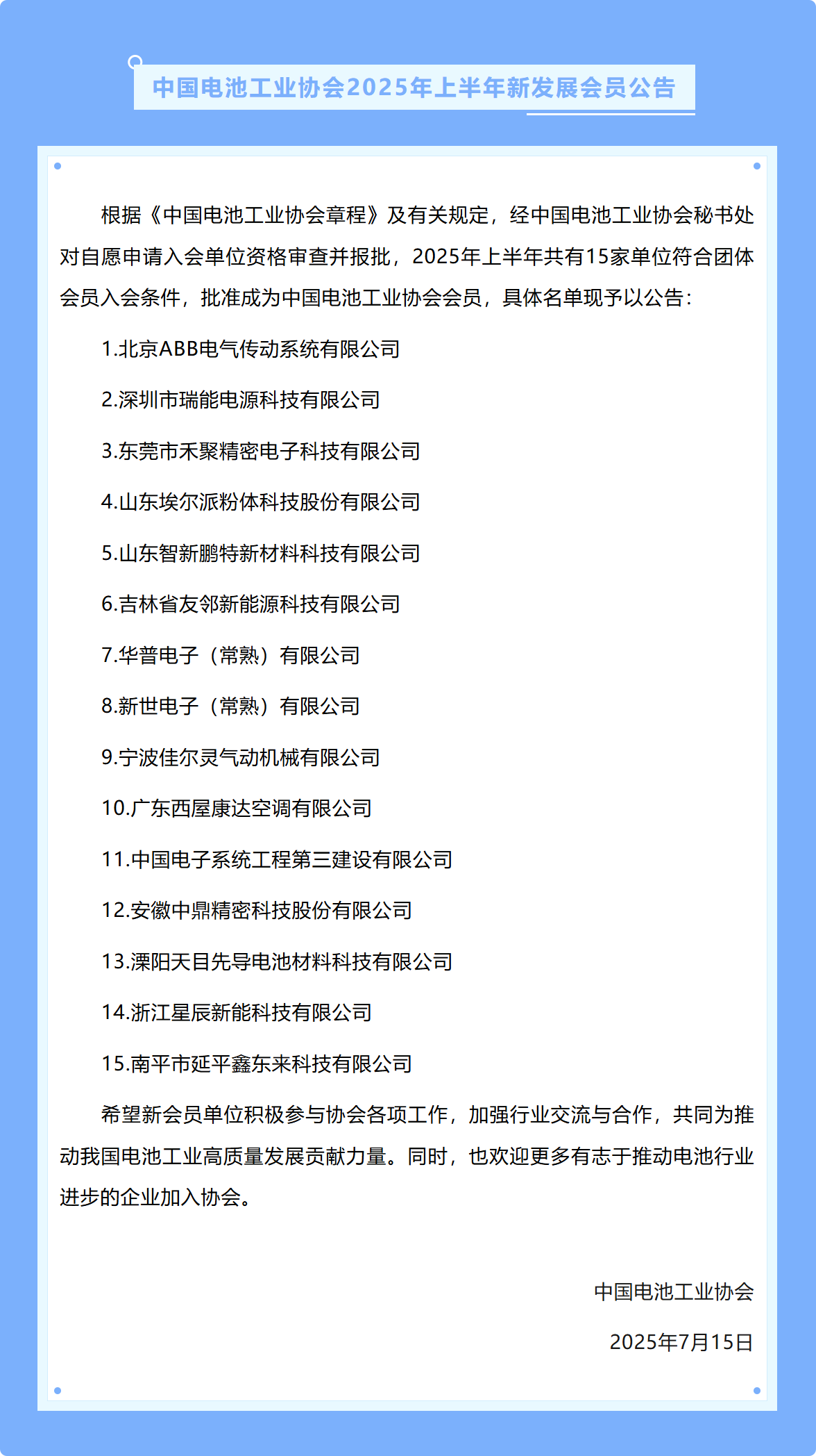 中國電池工業(yè)協(xié)會2025年上半年新發(fā)展會員公告