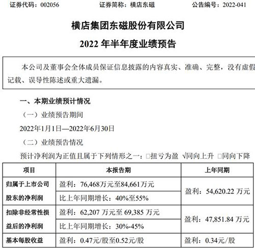 7月6日,橫店東磁(002056)近日發(fā)布2022年半年度業(yè)績預(yù)告,預(yù)計2022年上半年實現(xiàn)歸屬于上市公司股東的凈利潤76,468萬元至84,661萬元,上年同期54,620.22萬元,比上年同期增長40%至55%,基本每股收益0.47元-0.52元,上年同期0.34元。