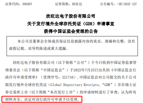 7月26日晚,欣旺達(dá)(300207.SZ)發(fā)布公告稱,公司于今日收到中國(guó)證監(jiān)會(huì)于2022年7月25日出具的《中國(guó)證監(jiān)會(huì)行政許可申請(qǐng)受理單》(受理序號(hào):221716),中國(guó)證監(jiān)會(huì)對(duì)公司提交的關(guān)于公司擬發(fā)行境外全球存托憑證(Global
