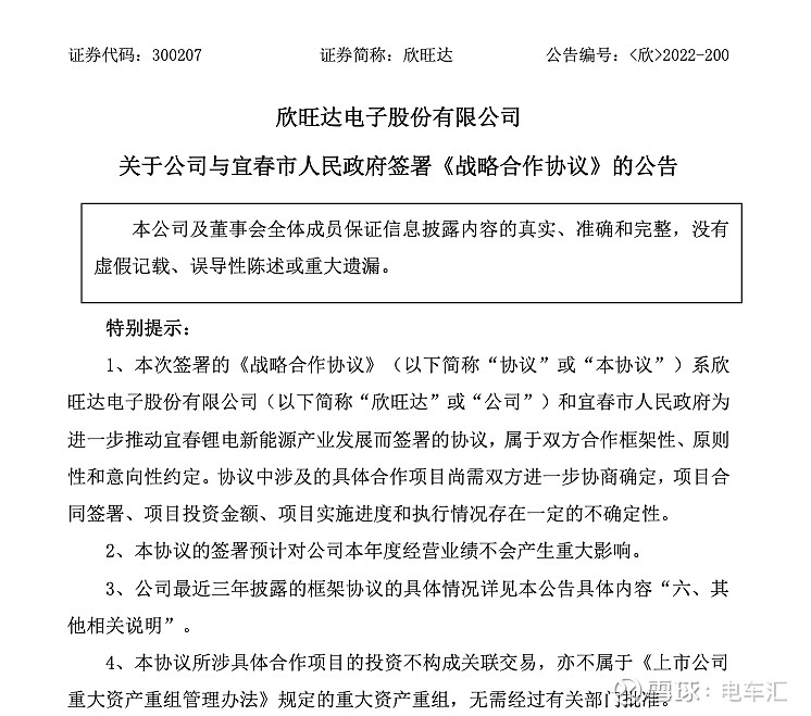欣旺達(dá)稱,本協(xié)議的簽署是基于雙方共同的發(fā)展愿望和相互契合的發(fā)展優(yōu)勢,旨在共同構(gòu)建從碳酸鋰生產(chǎn)、鋰電池關(guān)鍵材料到鋰電池回收利用的產(chǎn)業(yè)鏈體系,助力公司鞏固自身在動(dòng)力電池行業(yè)的地位。公司借助宜春的礦產(chǎn)資源及優(yōu)惠政策和新能源鋰電產(chǎn)業(yè)的發(fā)展機(jī)遇,有利于保障公司上游鋰資源的供應(yīng),對(duì)降低公司上游原材料成本有積極影響;有利于加快推進(jìn)公司新能源鋰電材料上下游一體化戰(zhàn)略,完善公司在鋰電產(chǎn)業(yè)鏈的布局;有利于鞏固公司在動(dòng)力電池行業(yè)的領(lǐng)先地位,進(jìn)一步提升公司業(yè)務(wù)的核心競爭力以及盈利能力,符合公司發(fā)展戰(zhàn)略以及整體利益。