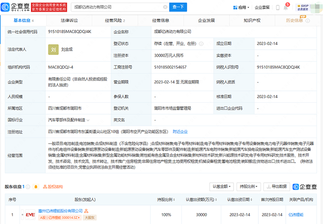企查查APP顯示,2月14日,成都億緯動力有限公司成立,法定代表人為劉金成,注冊資本3億元人民幣,經(jīng)營范圍包含:新能源原動設(shè)備制造;新能源原動設(shè)備銷售;汽車零部件及配件制造;新能源汽車電附件銷售;新能源汽車換電設(shè)施銷售;新能源汽車生產(chǎn)測試設(shè)備銷售等。企查查股權(quán)穿透顯示,該公司由億緯鋰能(300014)100%控股。