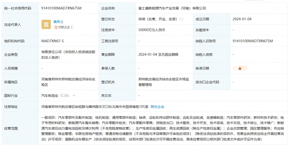 企查查顯示,1月4日,富士康新能源汽車產(chǎn)業(yè)發(fā)展(河南)有限公司成立,法定代表人為黃英士,注冊(cè)資本5億人民幣,經(jīng)營范圍含汽車零部件及配件制造、電機(jī)制造、新材料技術(shù)研發(fā)、新能源汽車整車銷售、企業(yè)總部管理、園區(qū)管理服務(wù)、供應(yīng)鏈管理服務(wù)、道路機(jī)動(dòng)車輛生產(chǎn)等。股東信息顯示,該公司由富士康新事業(yè)發(fā)展集團(tuán)有限公司全資持股,后者為鴻富錦精密電子(鄭州)有限公司全資子公司。