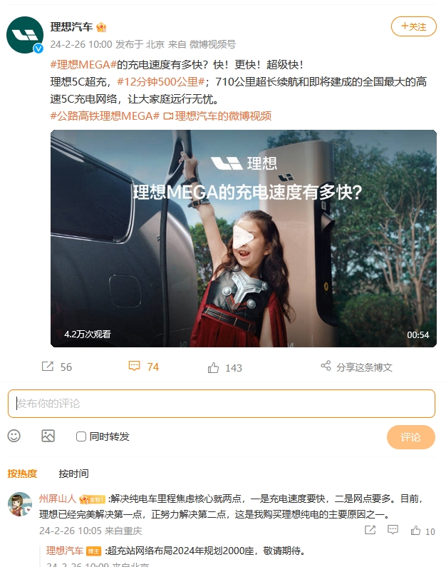 2月26日,理想汽車官方微博回復(fù)評論時表示,超充站網(wǎng)絡(luò)布局2024年規(guī)劃2000座。理想汽車還表示,截至2024年2月20日,理想超充站在全國已有343座,布局114個城市。