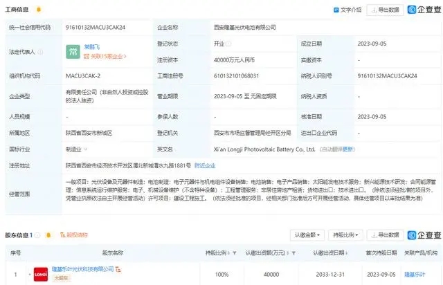 企查查APP顯示,近日,西安隆基光伏電池有限公司成立,注冊資本4億元,經(jīng)營范圍包含:光伏設(shè)備及元器件制造;電池制造;太陽能發(fā)電技術(shù)服務(wù);新興能源技術(shù)研發(fā)等。企查查股權(quán)穿透顯示,該公司由隆基綠能間接全資控股。