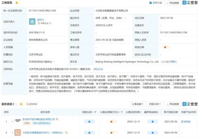 企查查APP顯示,近日,北京臥龍智慧氫能技術(shù)有限公司成立,法定代表人為龐欣元,注冊(cè)資本2000萬(wàn)元,經(jīng)營(yíng)范圍包含:氣體、液體分離及純凈設(shè)備銷(xiāo)售;儲(chǔ)能技術(shù)服務(wù);半導(dǎo)體器件專(zhuān)用設(shè)備銷(xiāo)售等。企查查股權(quán)穿透顯示,該公司由臥龍電驅(qū)、北京臥龍智慧氫能科技中心(有限合伙)共同持股。