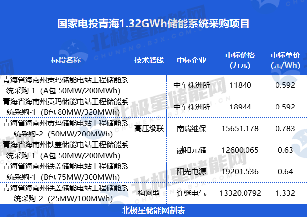 2月19日,青海省海南州貢瑪、鐵蓋儲能電站工程儲能系統(tǒng)采購招標中標結(jié)果公布,六個標段分別被中車株洲所、南瑞繼保、融和元儲、陽光電源、許繼電氣五家企業(yè)斬獲,六大標段總?cè)萘?.32GWh。